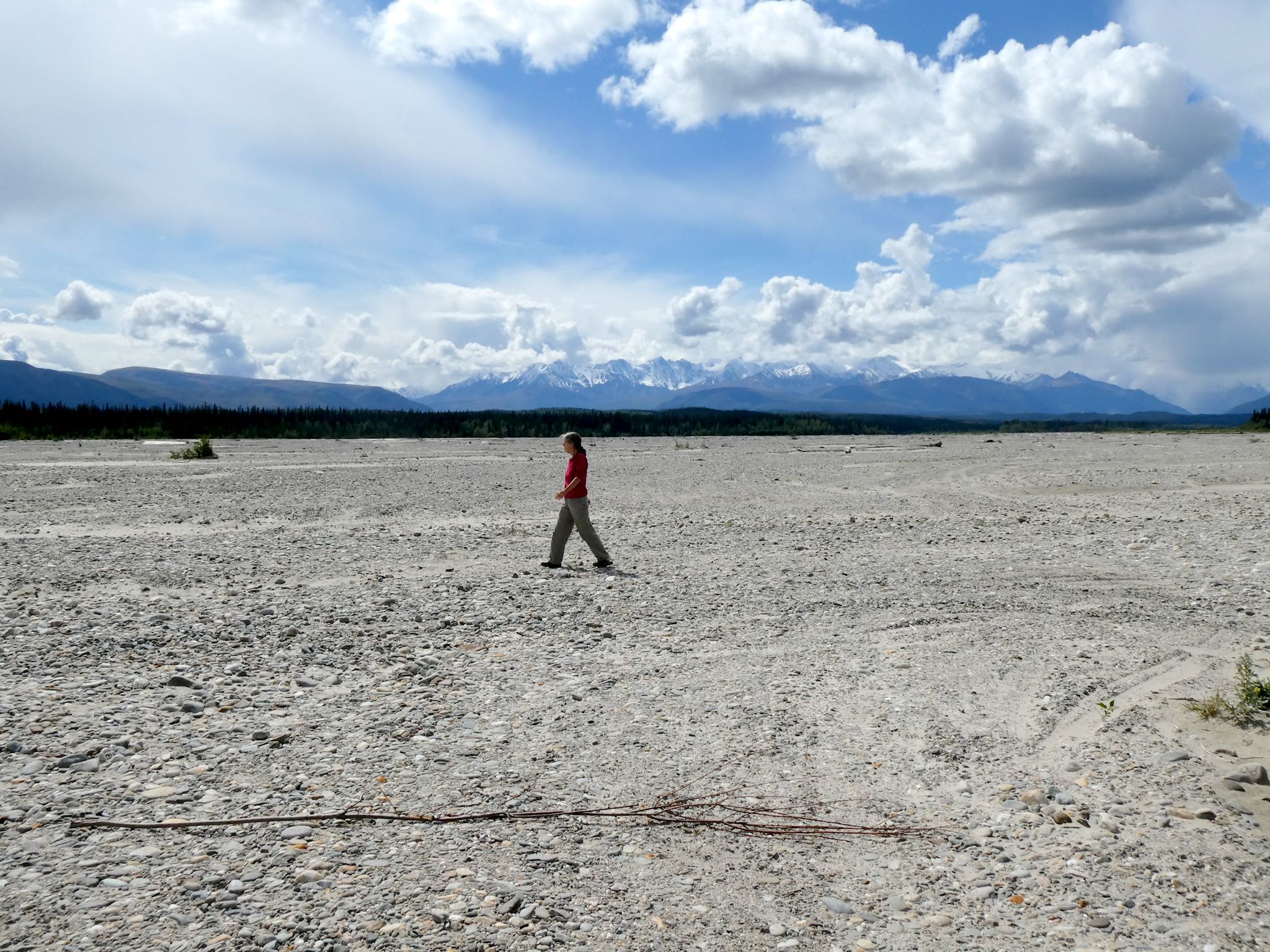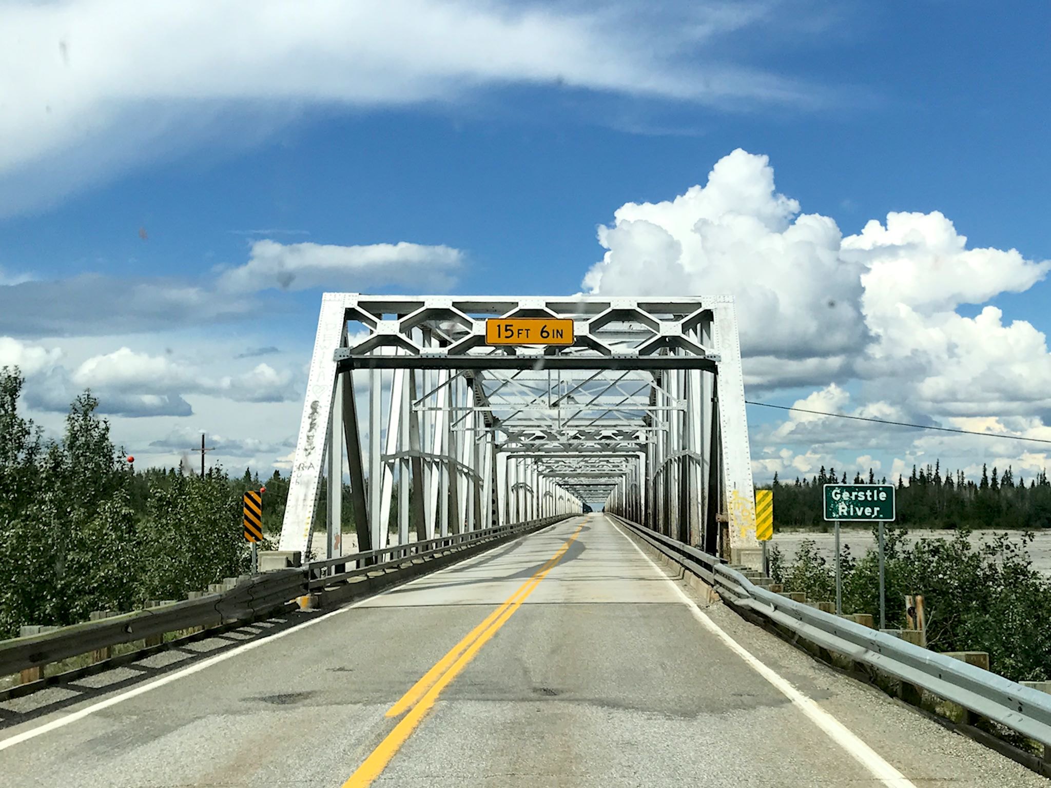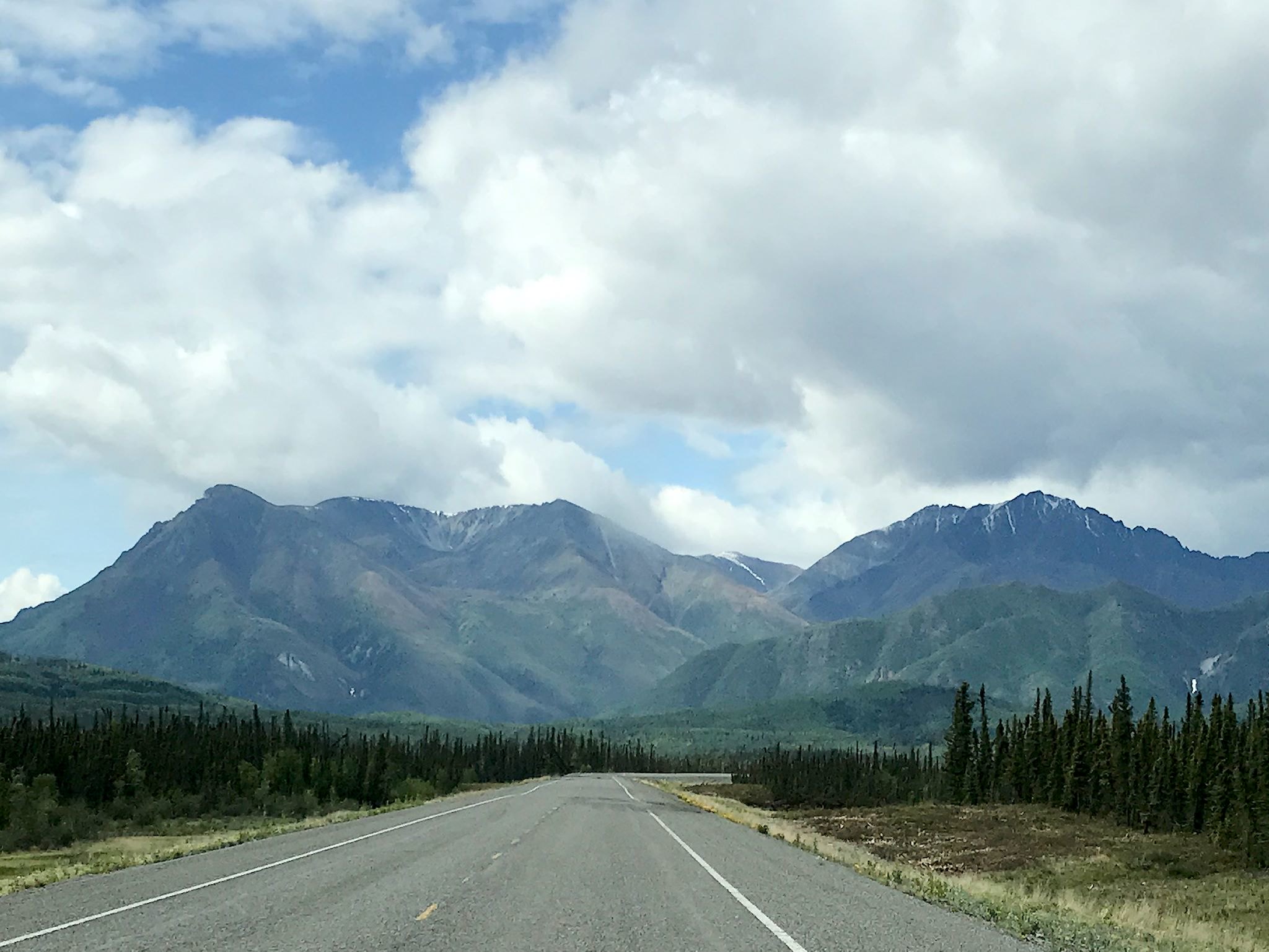 Back to the last third of the Alaska Highway… The drive through Yukon and extreme eastern Alaska is very pretty – and pretty sparsely populated. Most of Yukon is mountainous and we always enjoy rounding a corner or topping a hill to find yet another mountain peak in our faces or another picturesque lake. Near and across the border, the terrain changed to taiga – long, rolling valleys of swampy coniferous forests split by wide, shallow braided rivers.